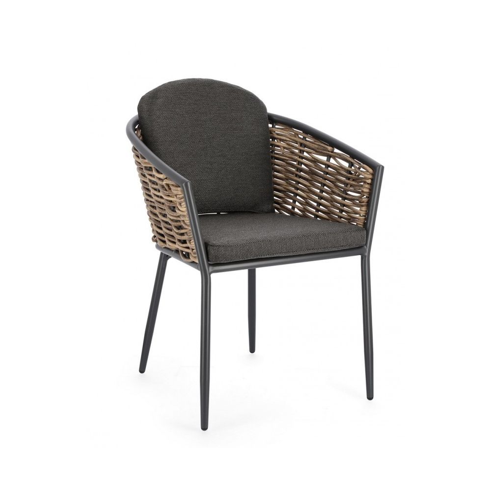 ALUMINIUM FRAME AND LEGS POWDER COATED (POLYESTER). SEAT COVERED IN SYNTHETIC FIBER WEAVING (ROUND 9MM). SEAT AND BACK CUSHIONS WITH REMOVABLE COVER IN WATER REPELLENTOLEFIN FABRIC (100% POLYPROPYLENE). STACKABLE.