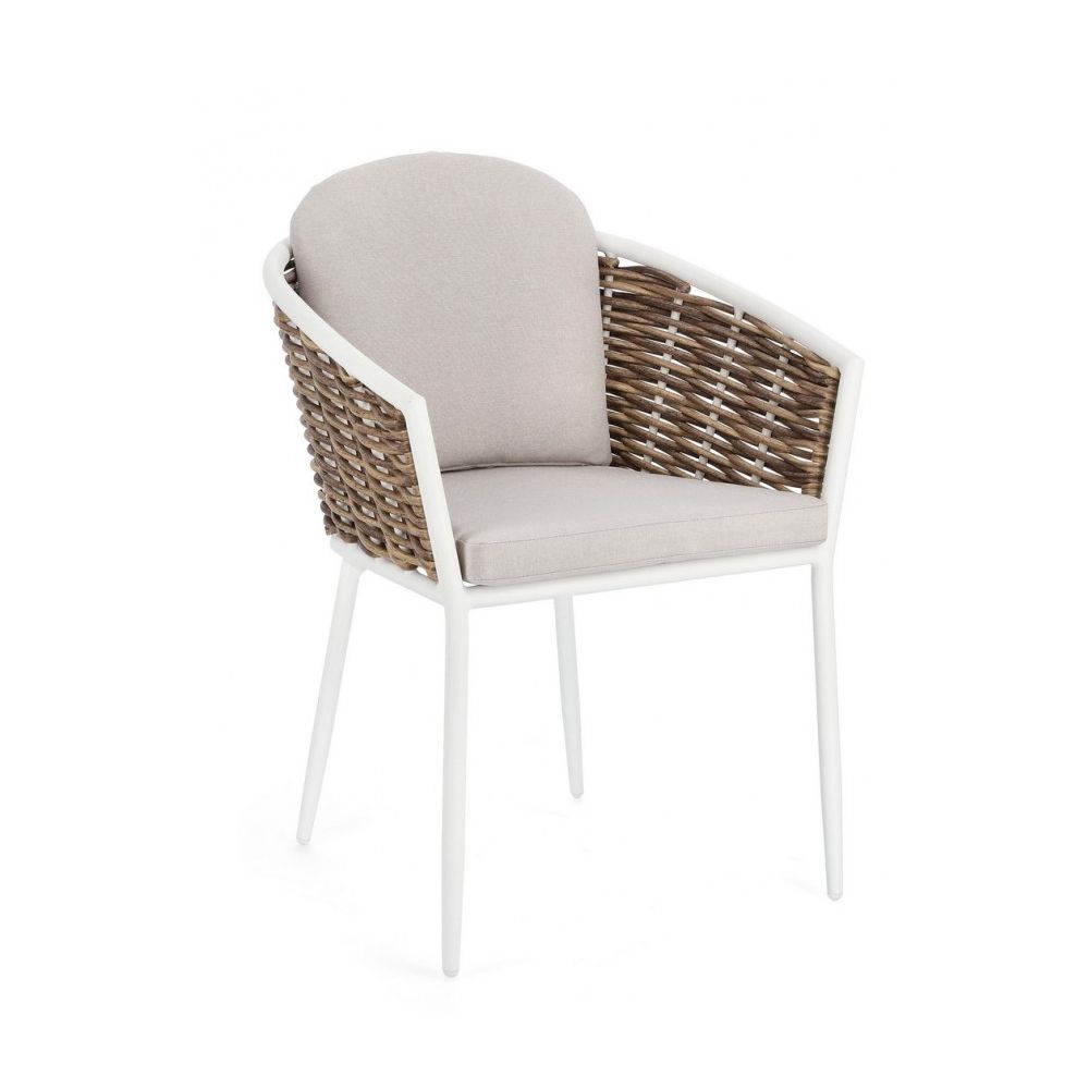 ALUMINIUM FRAME AND LEGS POWDER COATED (POLYESTER). SEAT COVERED IN SYNTHETIC FIBER WEAVING (ROUND 9MM). SEAT AND BACK CUSHIONS WITH REMOVABLE WATER REPELLENT COVER IN OLEFIN FABRIC (100% POLYPROPYLENE). STACKABLE.
