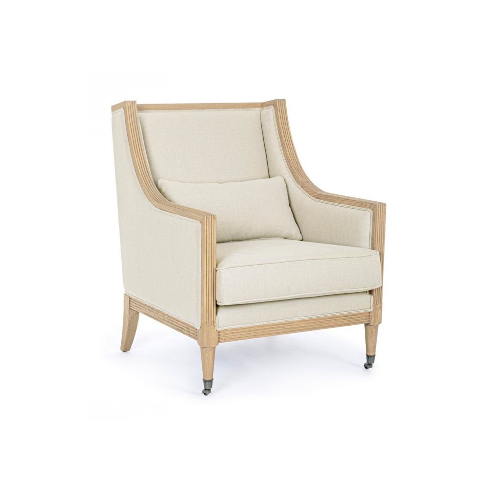 FRAME IN ASH WOOD, COVERING IN 100% LINEN. POLYURETHANE FOAM PADDING DENSITY SEAT 30KG/M3, BACKREST 25KG/M3. CUSHIONS WITH REMOVABLE COVER. WITH GALVANIZED STEEL FRONT WHEELS INCLUDED.