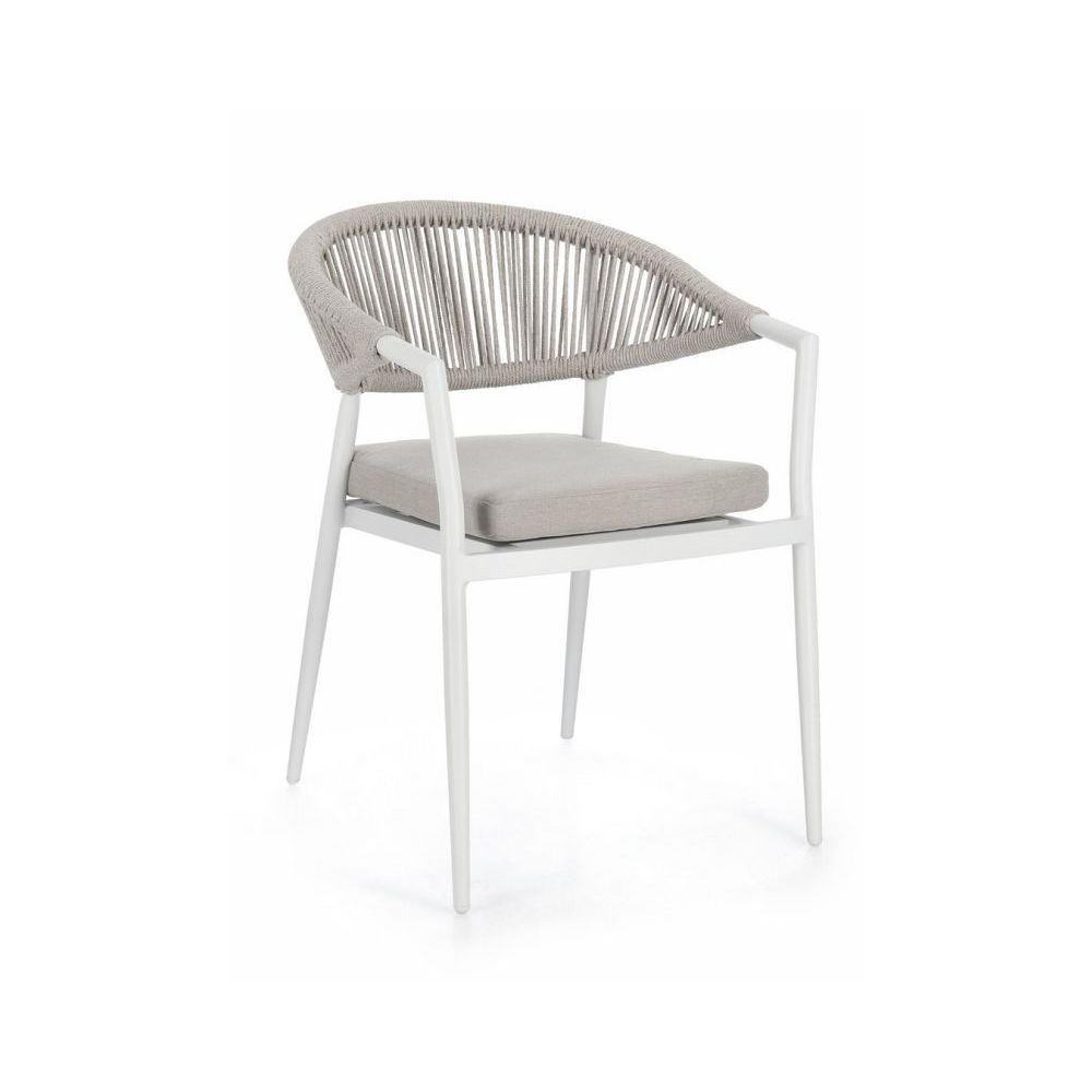 STRUCTURE IN POWDER-COATED ALUMINIUM (POLYESTER). WEAVING FOR OUTDOOR USE IN POLYESTER ROPE. REMOVABLE CUSHIONS IN 100% WATER-REPELLENT POLYESTER. STACKABLE.
