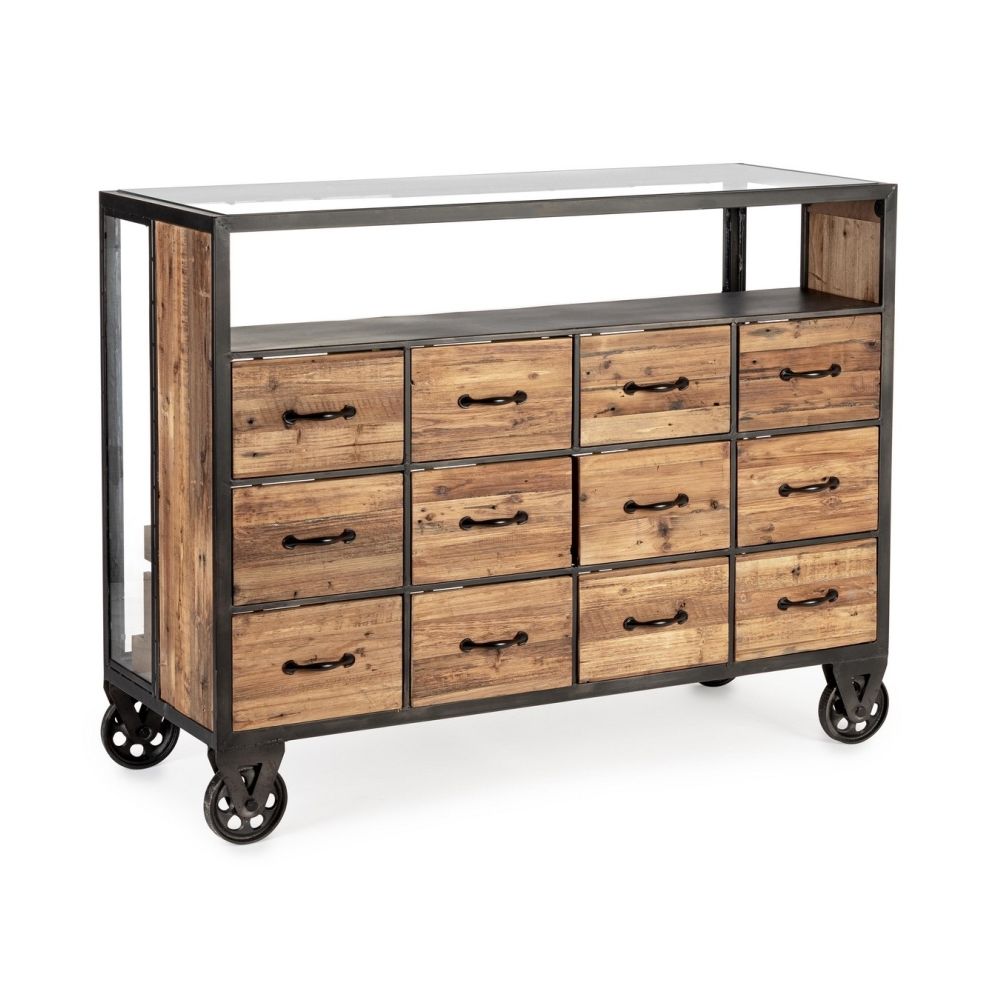 STRUCTURE IN POWDER-COATED STEEL. GLASS TOP. DRAWERS IN FIR AND MDF WOOD. RUBBER WHEELS. TO BE ASSEMBLED