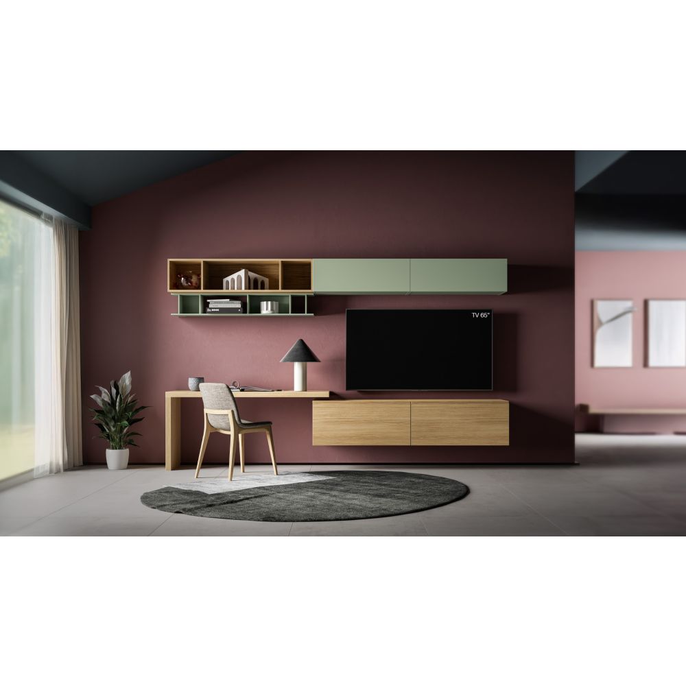 Both, with this wall composition. Modern living room made up of compact volumes evenly distributed between shelves and wall units,