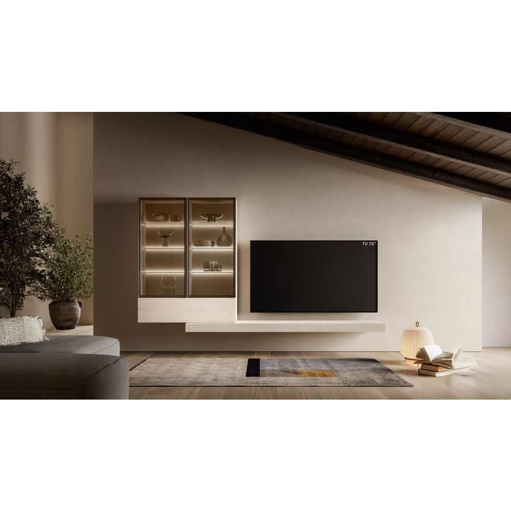 The Cento shelf, which serves as a storage surface, complements the wall cabinet with drop-down door and glass display cabinets in a practical and refined design, ideal for a modern and elegant living room. *Décor selection available (contact us)