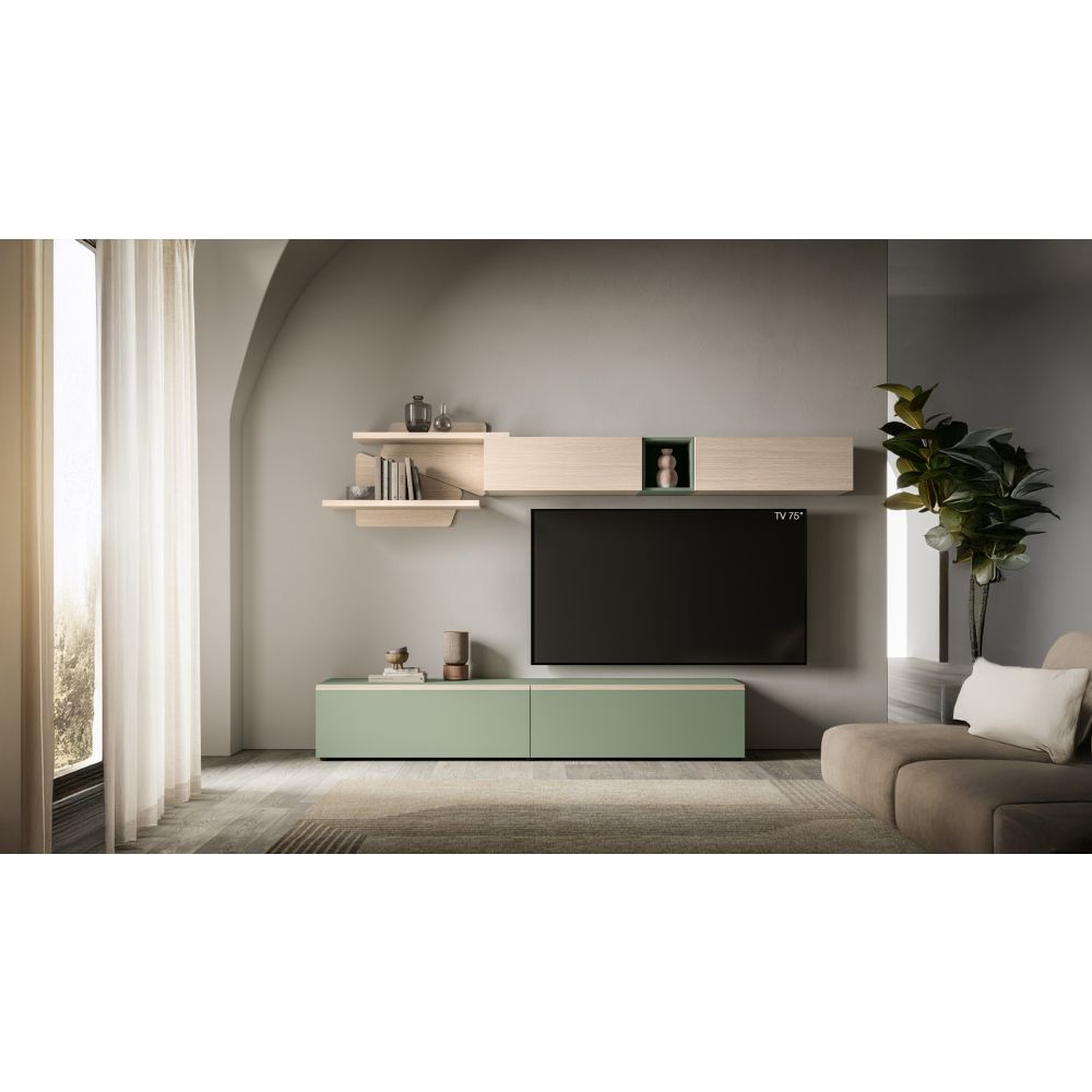 Closed floor base units and modules combined with open units. We are talking about the minimalist Opera shelves, sturdy surfaces that enhance the space with balance and style. *Décor selection available (contact us)