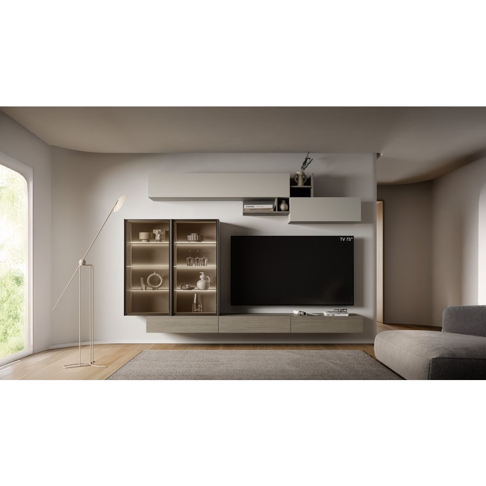 The glass display units and shelves highlight the objects, while base units with drawer and storage units guarantee the right degree of privacy. Ideal solution for a practical and contemporary living room that elevates every detail. *Décor selection available (contact us)