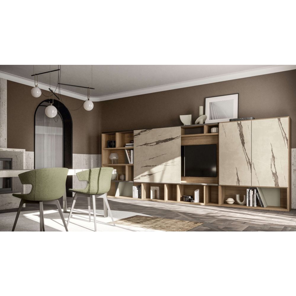 Elegance is expressed in the finishing touches. The solid doors in the light shades of the Statuario finish, which reproduces the texture of marble, meet the warm wooden tones of Matwood Coffee. This combination of textures gives the space a natural and sophisticated look.