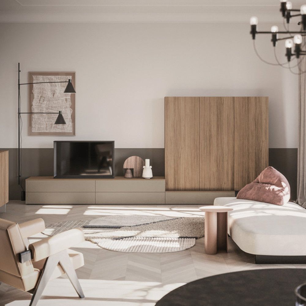 A shelving unit with open and closed compartments is built into the wall cabinet, clearly demonstrating the flexibility and multifunctionality of the furniture from the Homy collection.
