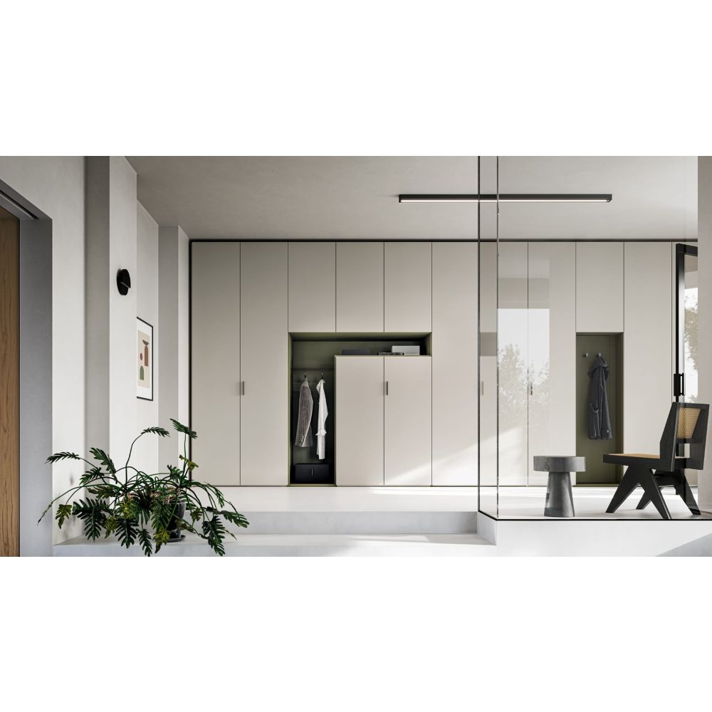 The wardrobe with hinged doors and a straight-line design is available in different colours and finishes and can be configured to include open compartments.