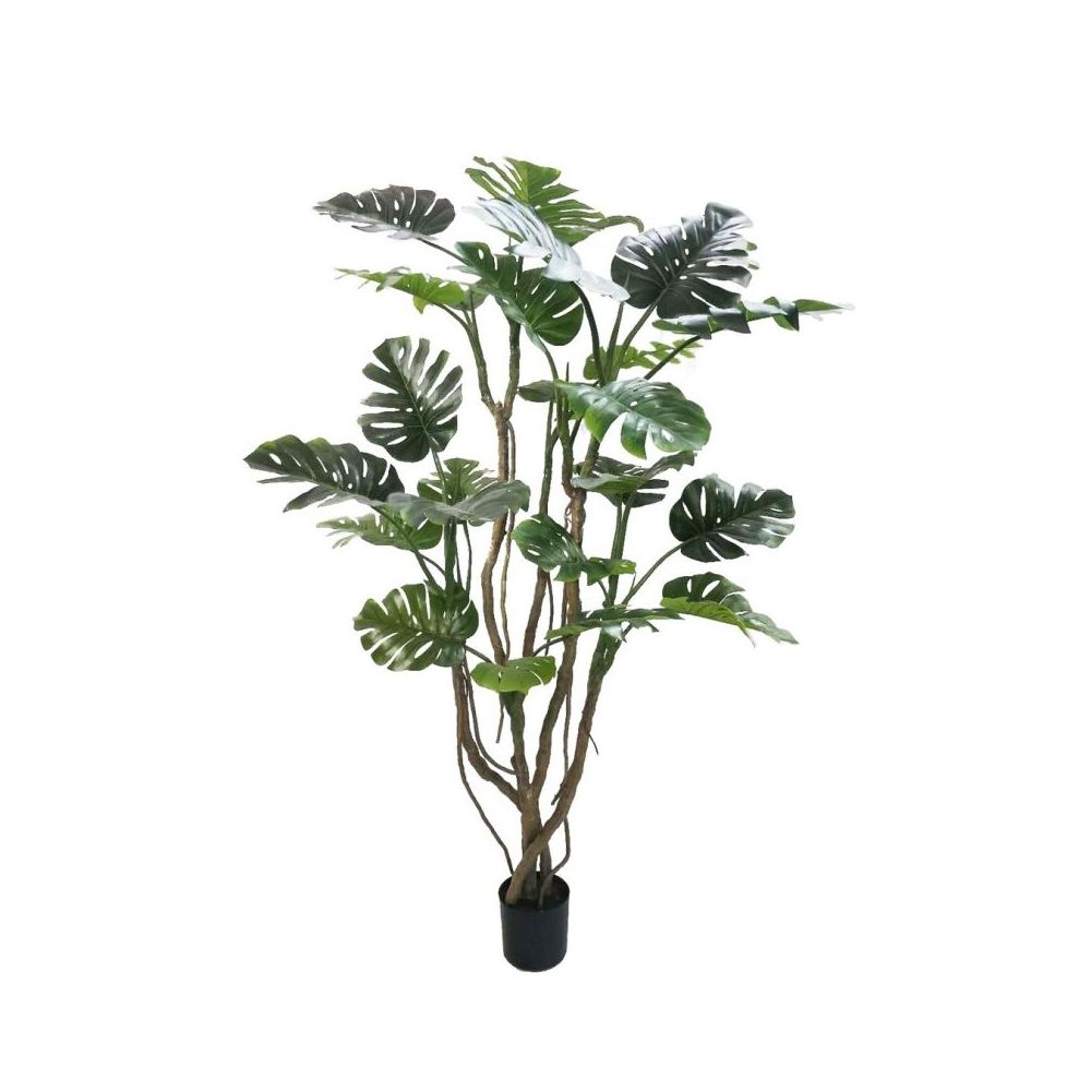 RUBBER LEAVES, POLYURETHANE TRUNK, METAL, PLASTIC VASE, CONCRETE VASE CONTENTS.