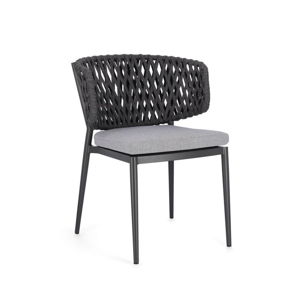 ALUMINIUM FRAME, POWDER COATED (POLYESTER). WEAVING IN TETORON ROPE (100% POLYESTER). SEAT CUSHION WITH REMOVABLE COVER IN WATER REPELLENT ACRYLIC FABRIC. STACKABLE.