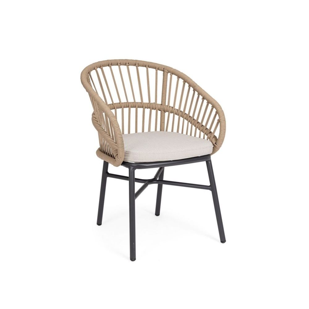 STRUCTURE IN POWDER-COATED ALUMINIUM (POLYESTER). WEAVING FOR OUTDOOR USE IN ROPE (POLYESTER). REMOVABLE CUSHIONS WITH OLEFIN WATER REPELLENT OLEFIN FABRIC (100% POLYPROPYLENE)STACKABLE. PACKAGING WITHOUT CARTON.