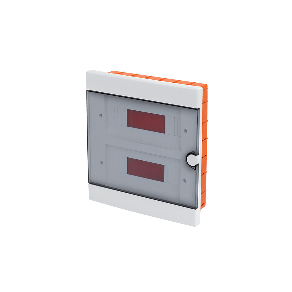 The distribution boxes are designed for mounting in newly built buildings or buildings in reconstruction. They are a module box with mounted protective devices of the given flats electrical current circuit circles. They are supplied with transparent door for each row opening upwards to 90°. They are made of white self-extinguishing plastic, resistant to heat and high temperature with IP code: IP 40. The mounted device in the box is protected from direct contact to the current leading parts. They are offered with DINrail for device mounting and terminal strips for the neutral and earthing conductor joining. Mounted directly on the walls with screws.