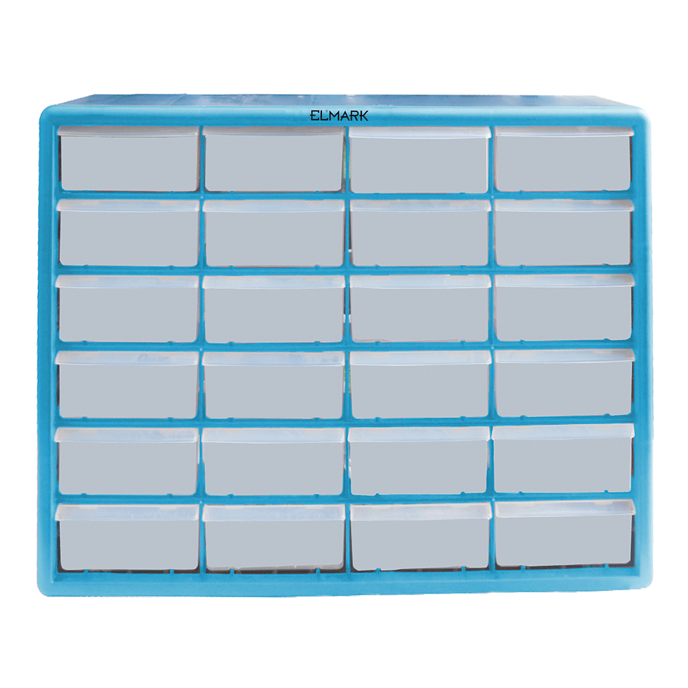 Made of plastic, with 24 drawers. Size: 500x160x390 mm – perfect for organizing small parts and accessories.