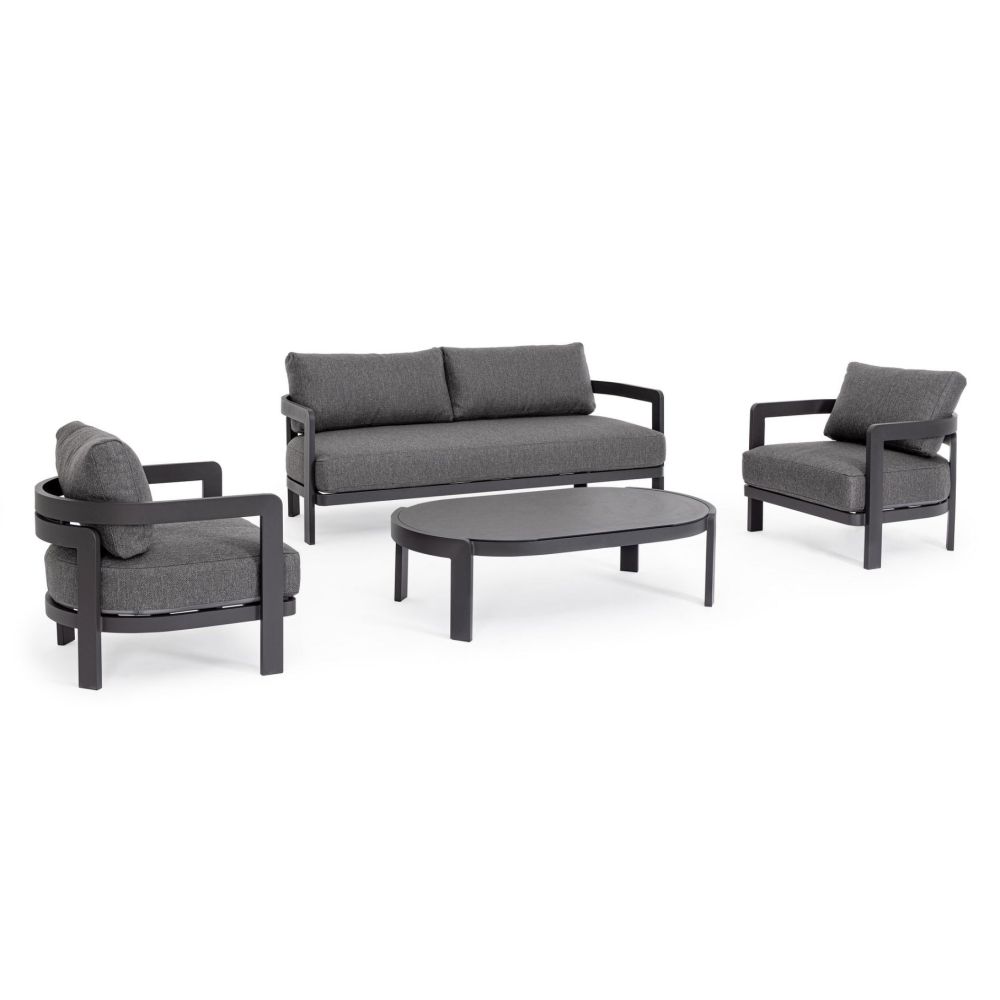 ALUMINIUM FRAME, POWDER COATED (POLYESTER). SEAT AND BACK CUSHIONS WITH REMOVABLE COVER IN WATER REPELLENT OLEFIN FABRIC (100% POLYPROPYLENE). COFFEE TABLE WITH PRINTED GLASS TOP.