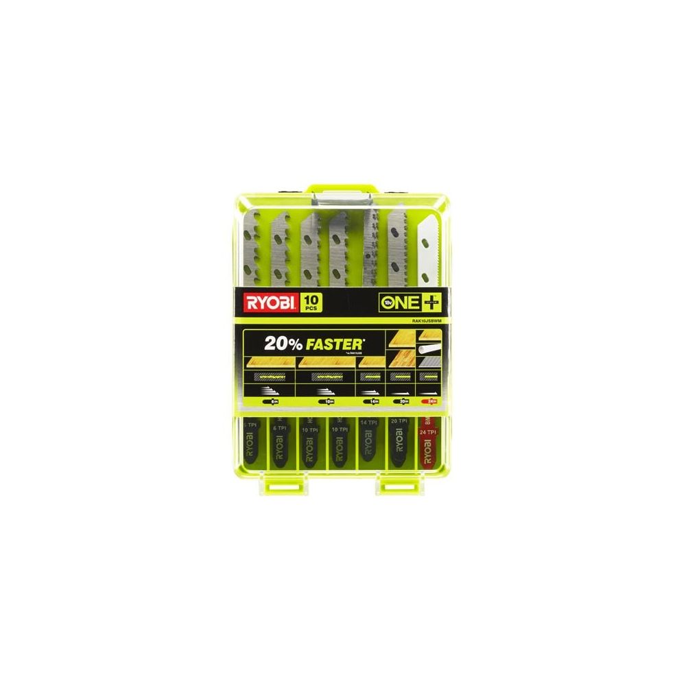 The Ryobi RAK10JSBWM Jigsaw Blade Set includes 10x blades with a range of TPI to achieve your desired finish when cutting wood, metal, plastic and laminate flooring. 6 and 10 TPI for fast straight cuts, 14 TPI for curved cuts, 20 TPI for precise cuts & laminate flooring, 24 TPI for metal and pipe applications Vented Technology removes debris easier and offers a 20% faster cuts in wood. Optimised tooth design for aggressive fast cuts. Featuring a T-Shank for compatibility with all T-Shank Jigsaws. Includes: 2 x HCS Fast Cut Blade (6TPI), 2 x HCS Fast Cut Blades (10TPI), 2 x HCS Scroll Cut Blades (14TPI), 2 x HCS Precise Cut Blades (20TPI), 2 x BIM Precise Cut Blades (24TPI).