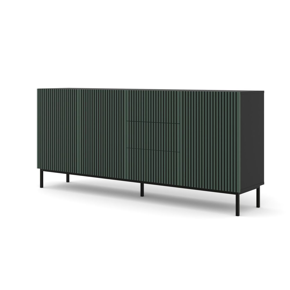 The Ravenna collection offers elegant and unique furniture for the living room. The milled fronts serve as an excellent decorative element, while the trendy colour combination of black and natural artisan oak enhances the aesthetic appeal. The furniture is crafted from high-quality materials, including milled and painted MDF. Elegant metal legs emphasize the stylish look and provide stability, and the handleless fronts add a touch of modern design. The three-door sideboard offers ample storage space, while the internal shelf makes organization easier.