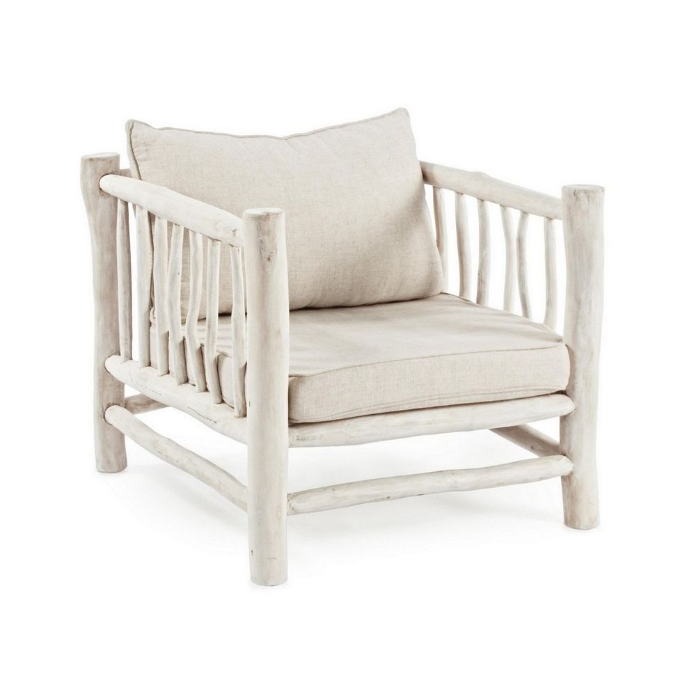 WHITE WASH TEAK BRANCHES WITH NITROCELLULOSE BASE PAINT FINISHING. CUSHIONS WITH REMOVABLE COVER FOR INDOOR USE (40% LINEN, 60% COTTON). FOR INDOOR USE ONLY. PACKING WITHOUT CARTON BOX.