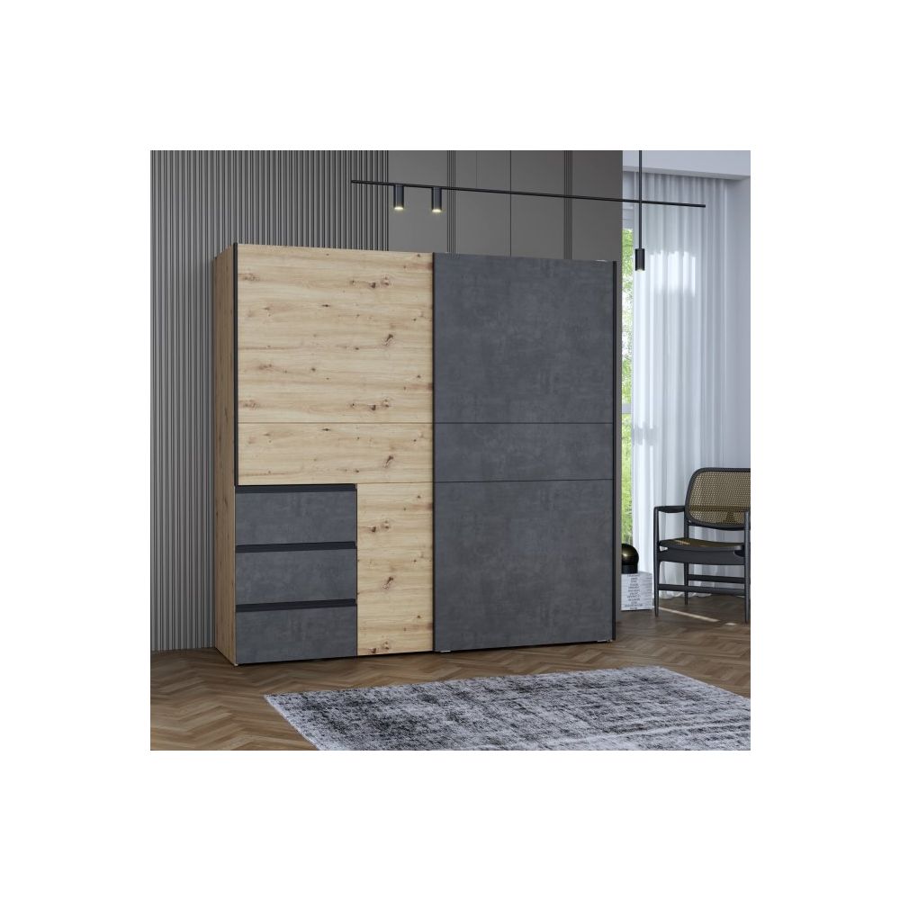 Spacious wardrobe in a unique color combination of Artisan Oak and dark grey concrete, designed for modern interiors. The irregular door shape adds originality and provides easier access to the built-in drawers. Perfect for bedrooms or walk-in closets.