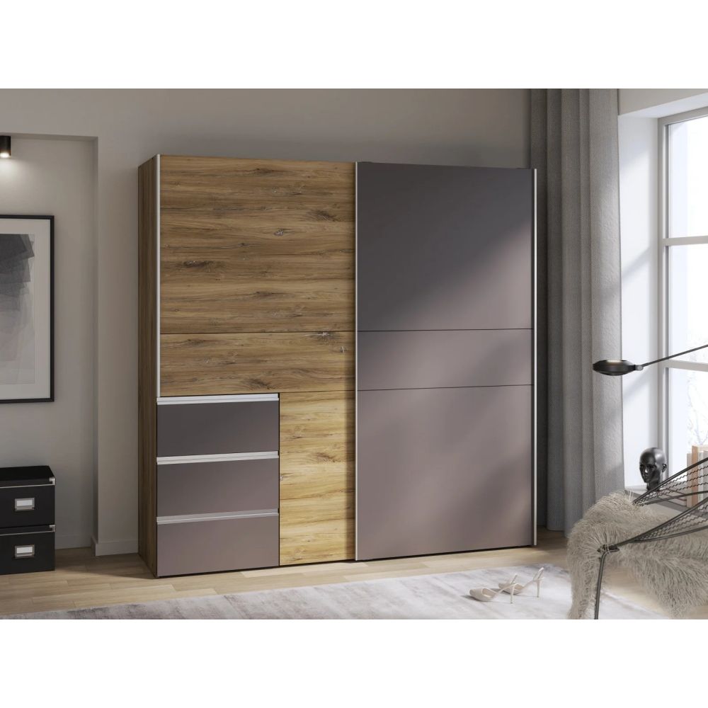 Spacious wardrobe in a unique color combination of Light Flagstaff Oak and Graphite, designed for modern interiors. The irregular door shape adds originality and provides easier access to the built-in drawers. Perfect for bedrooms or walk-in closets.