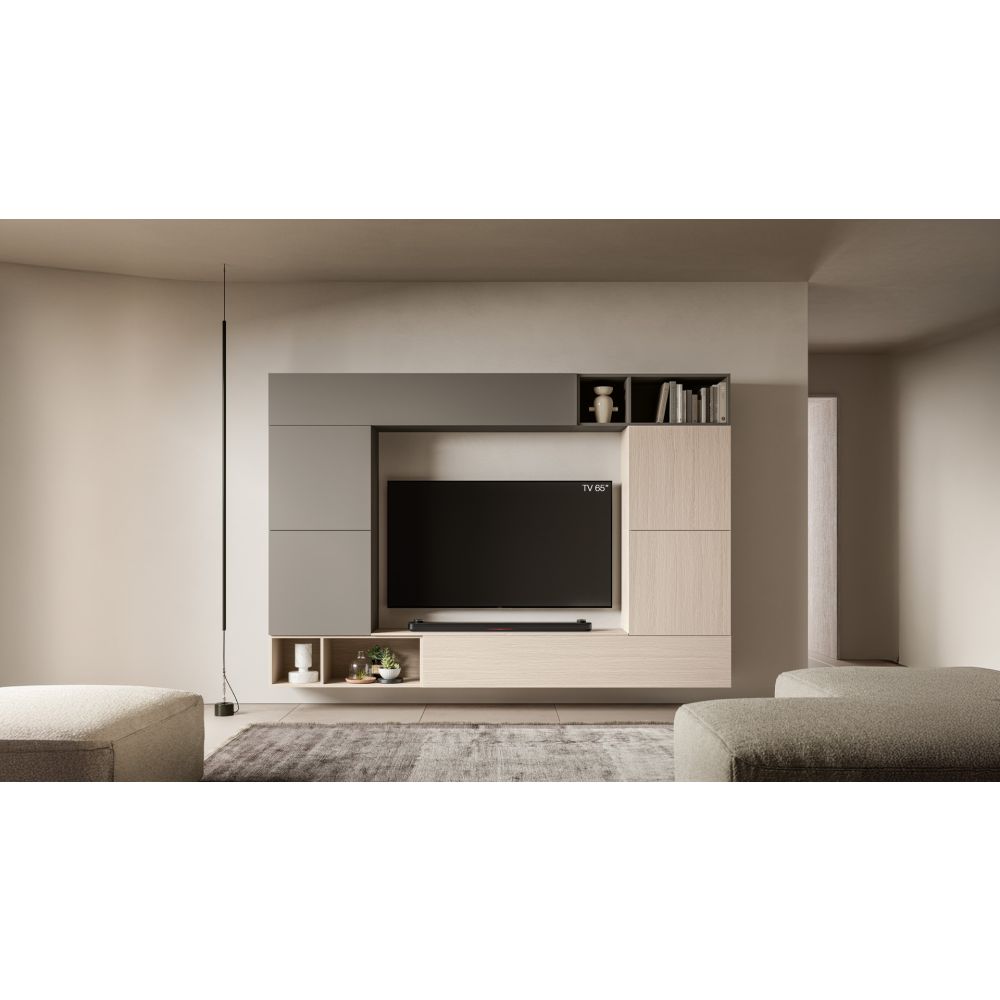 Композиция за дневна, която оформя телевизионното пространство с компактна и симетрична геометрия.Много място за съхранение и отворени модули за оптимизиране на организацията, особено в малки пространства.