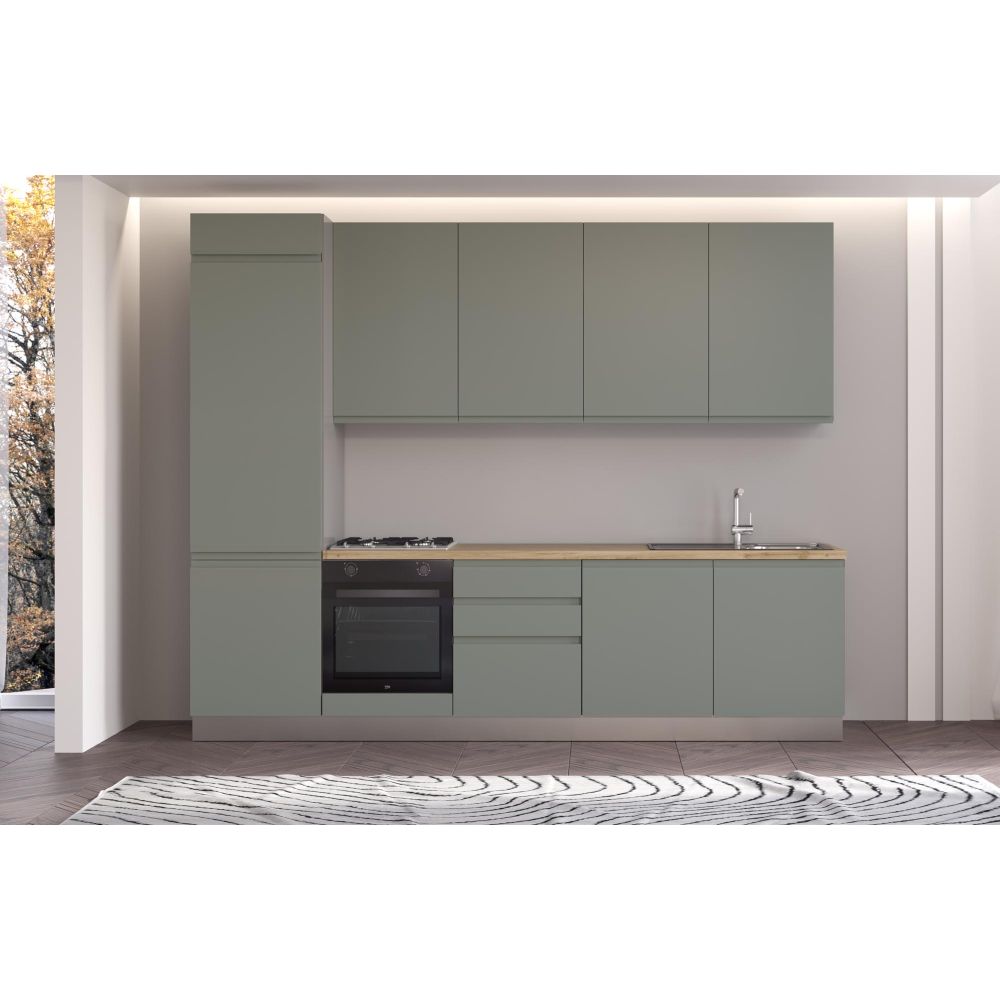 Straight kitchen IRENE, Left, 300 cm, green fronts, cadiz oak worktop, light grey wall panel