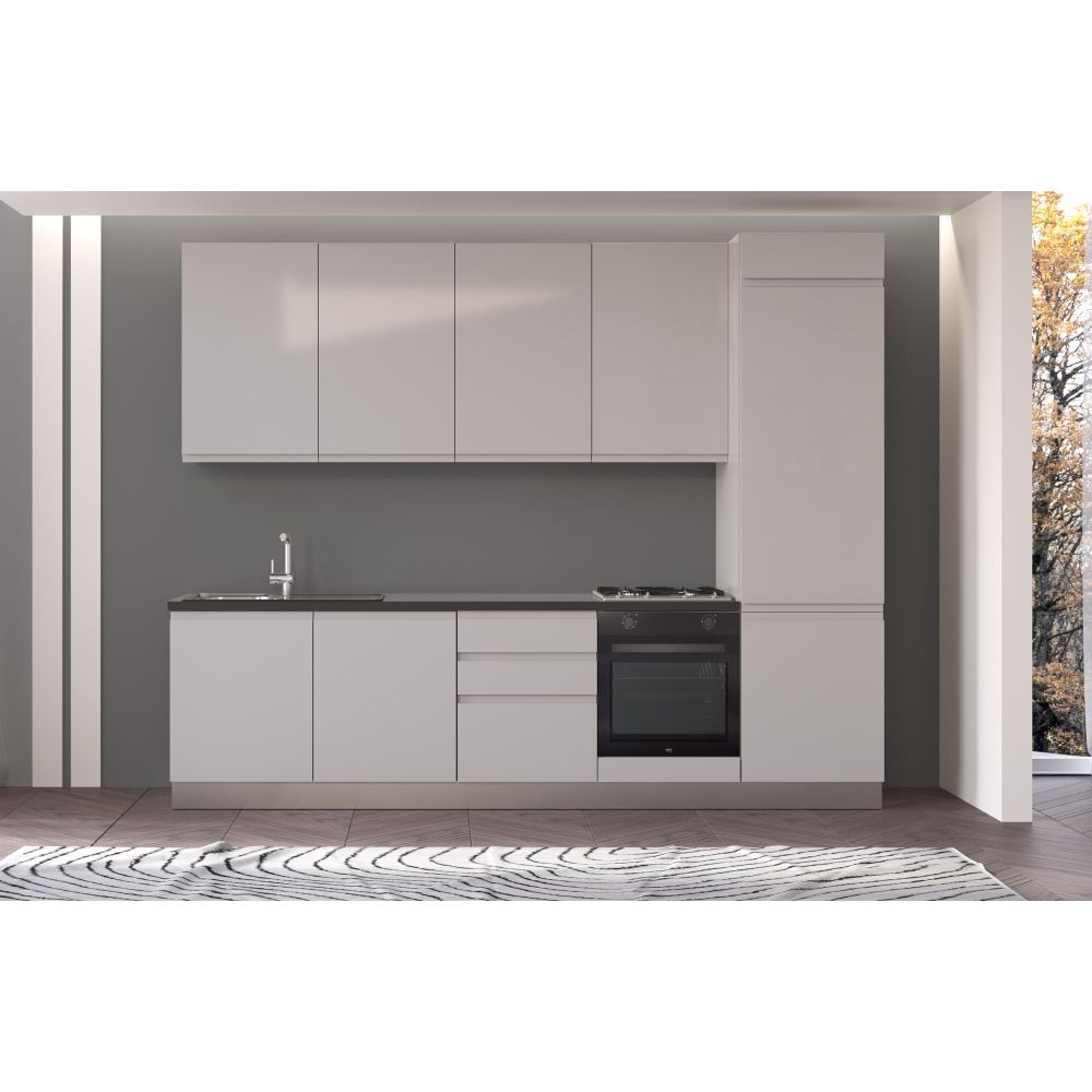 Straight kitchen IRENE, Right, 300 cm, light grey fronts, worktop and wall panel - anthracite
