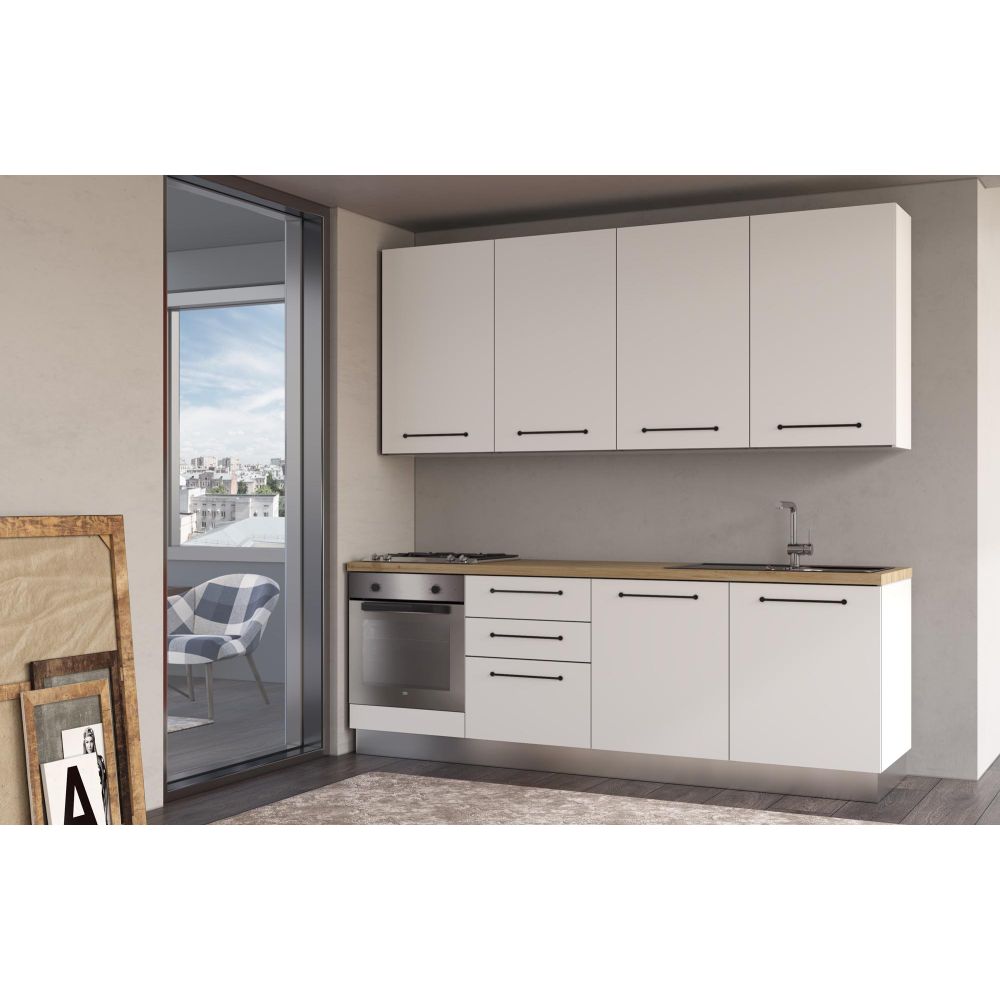 Straight kitchen LINE, 240 cm, white fronts, worktop - cadiz oak, wall panel - white
