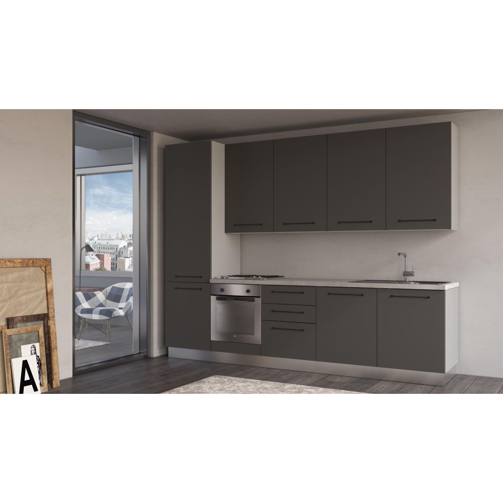 Straight kitchen set with chipboard doors and metal handles