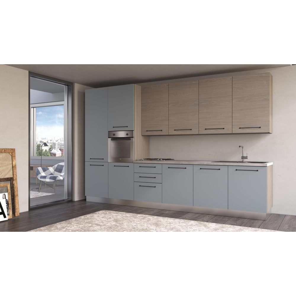 Straight kitchen set with chipboard doors and metal handles