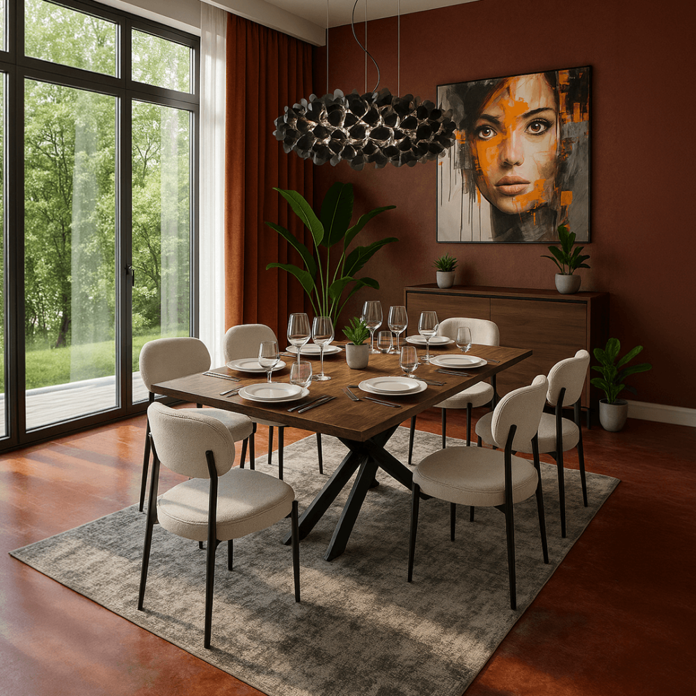Изтънчена трапезария, в която модерният дизайн среща артистичния дух – елегантна маса от естествено дърво, обградена от меки столове, подчертанa от дизайнерско осветление и впечатляващ арт акцент.