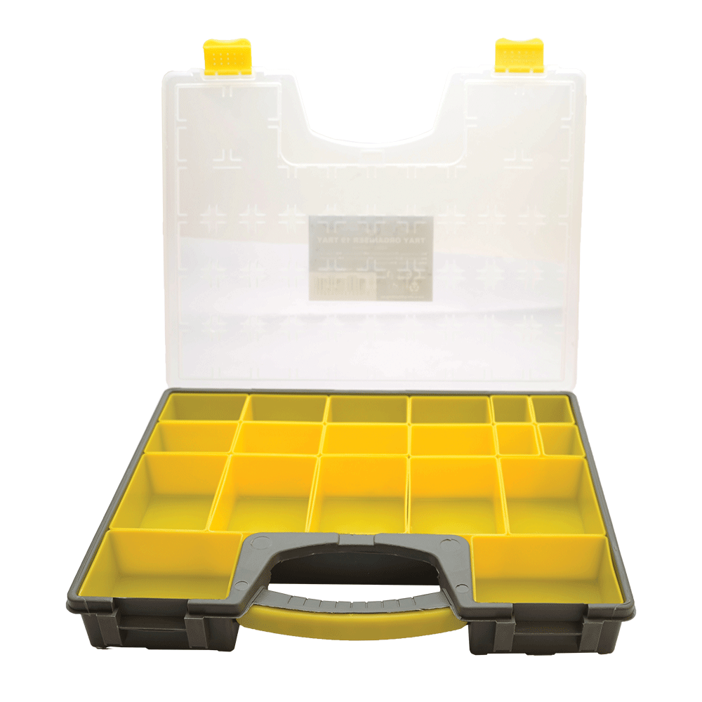 A practical plastic organiser box with 19 compartments and removable trays – perfect for storing tools, accessories, and small parts. Its compact size of 420x335x62 mm makes it easy to carry and store.