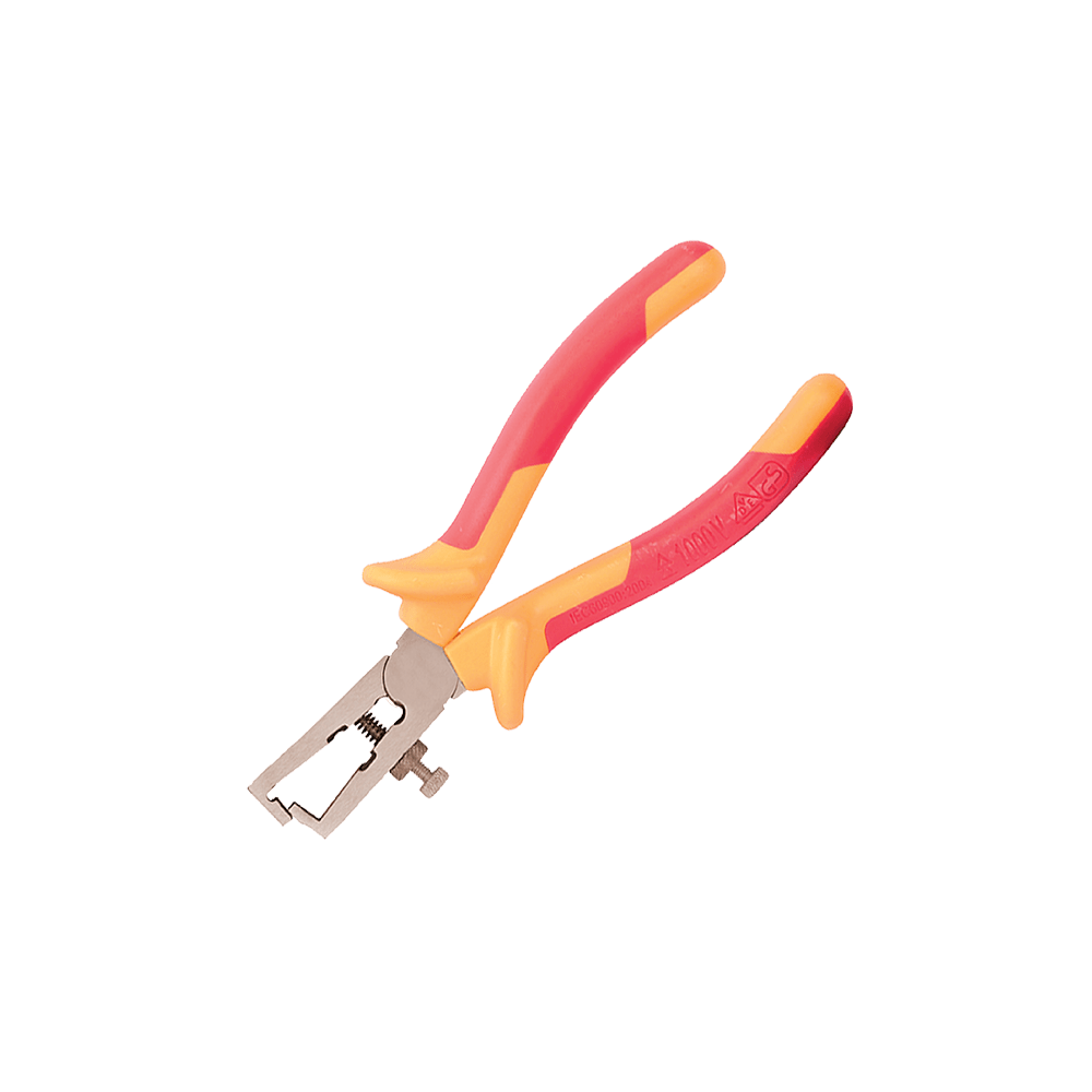 The 160 mm VDE insulated wire stripping pliers are designed for safe and efficient stripping of insulation from wires and cables under voltage up to 1000V. Made from high-quality chrome vanadium steel (CrV), these pliers provide excellent durability and precision during use. The special insulation offers protection against electric shock, making them suitable for use with electrical installations and equipment. Ideal for electricians and installers.
