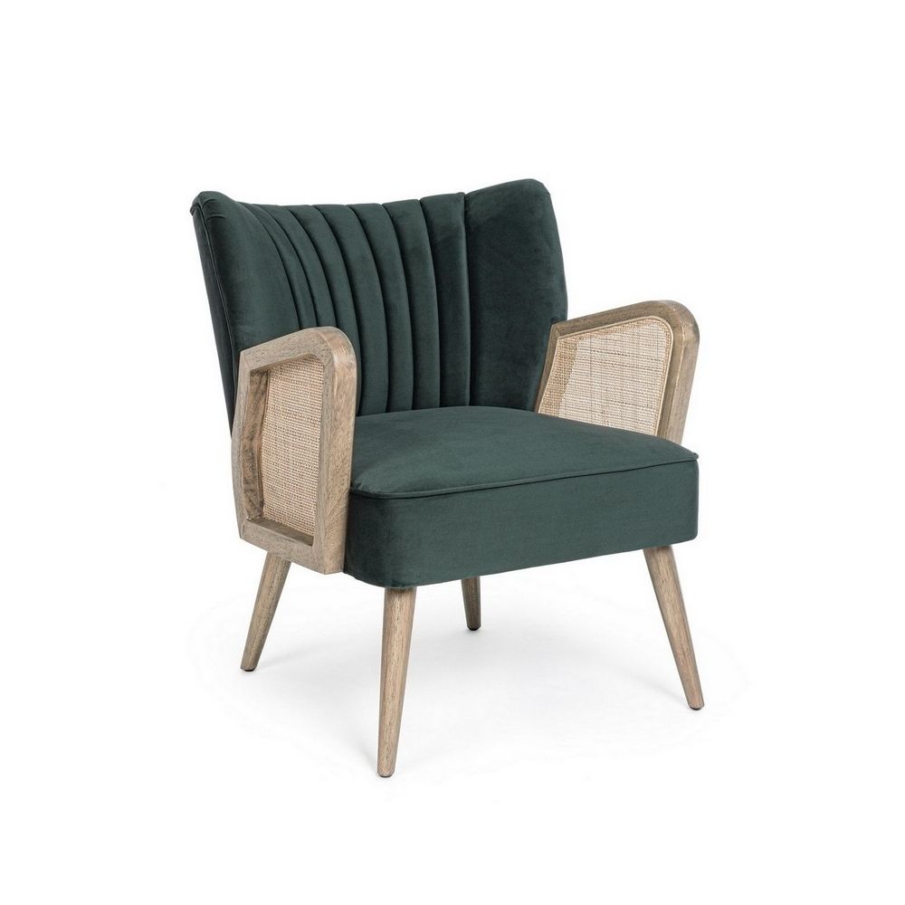 FRAME IN PINE WOOD AND PLYWOOD. RUBBERWOOD LEGS. ARMRESTS WITH RATTAN INSERTS. POLYESTER COVER WITH VELVET EFFECT. DENSITY OF POLYURETHANE FOAM FILLING 24 KG/M3. NOT REMOVABLE COVER. LEGS TO BE ASSEMBLED.