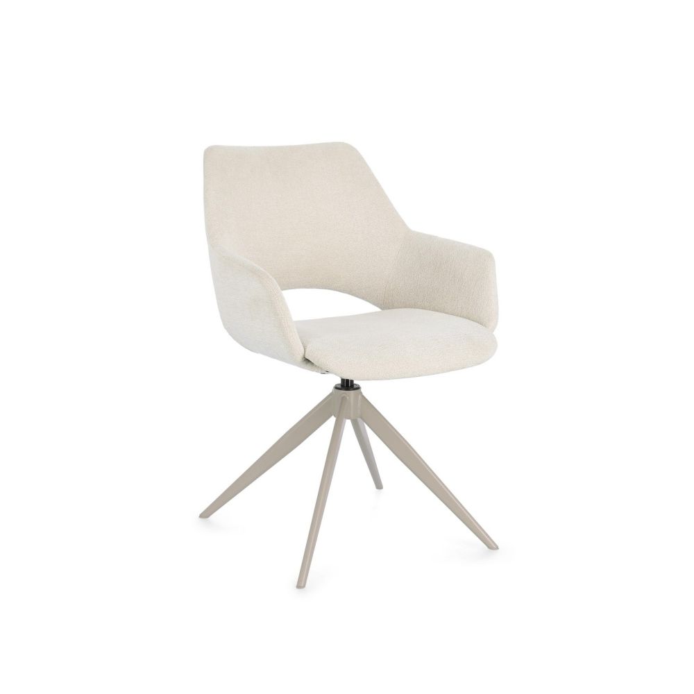 SEAT IN PLYWOOD WITH POLYURETHANE FOAM PADDING. COVER IN 100% POLYESTER. 360° ROTATABLE WITH RETURN MECHANISM. LEGS IN EPOXY POWDER COATED STEEL. LEGS TO BE ASSEMBLED